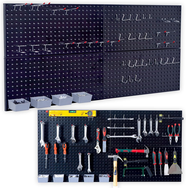 Pegboard Organizer Garage Storage - 48Pcs Pegboard Hooks Set, Pegboard Tool Organizer with 48X24 Inch Steel Peg Board & 4 Storage Bins (Black)